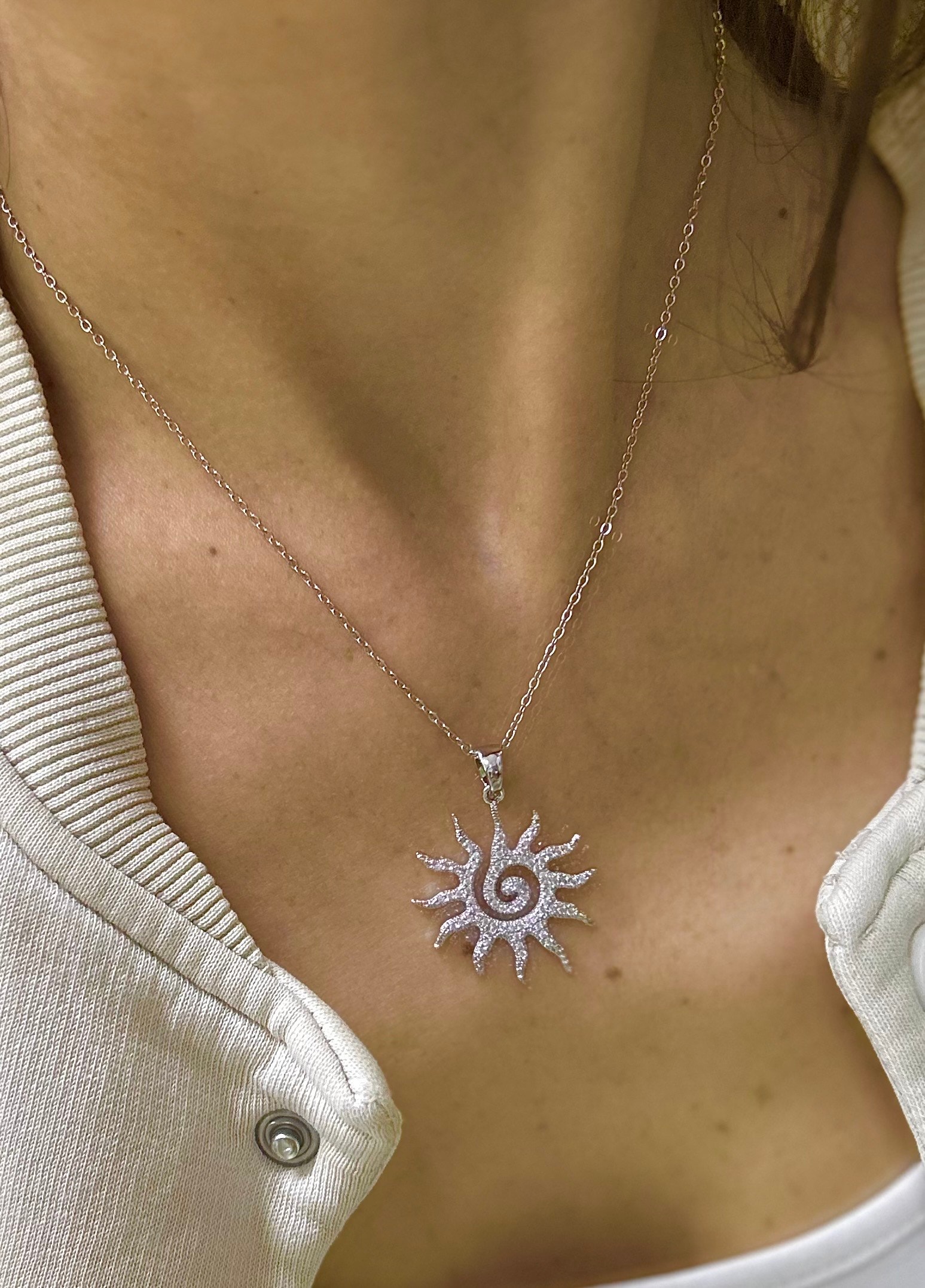 Çelik Gümüş Renk Taşlı Büyük Güneş Kolye